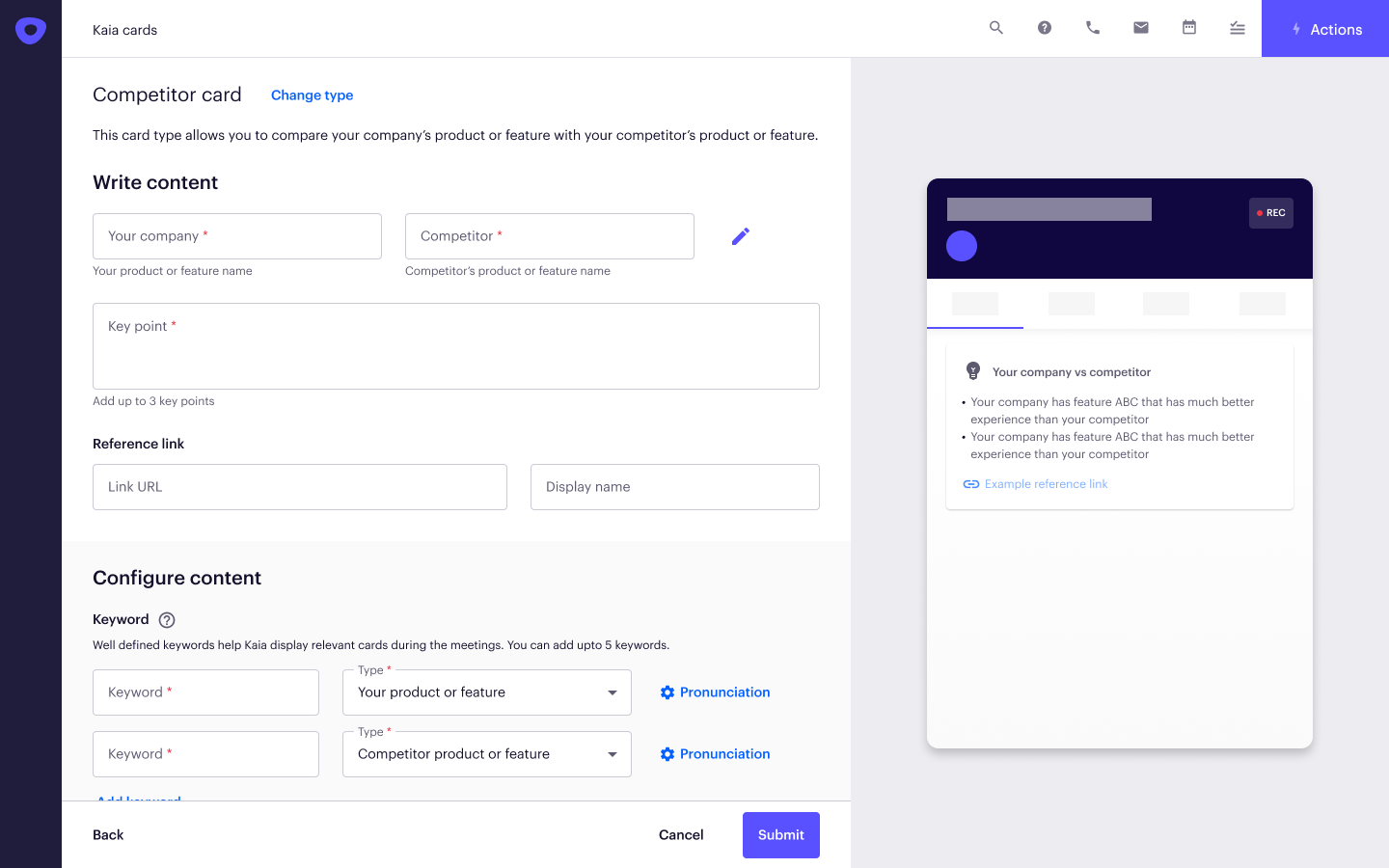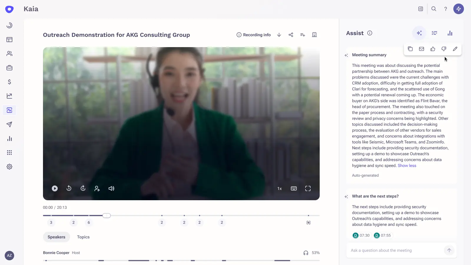 Outreach Kaia is an AI-powered real-time meeting intelligence tool that helps sales reps close deals faster. It uses real-time transcription and analysis to show content cards and suggest action items during live conversations, in order to deliver critical sales content when reps need it.