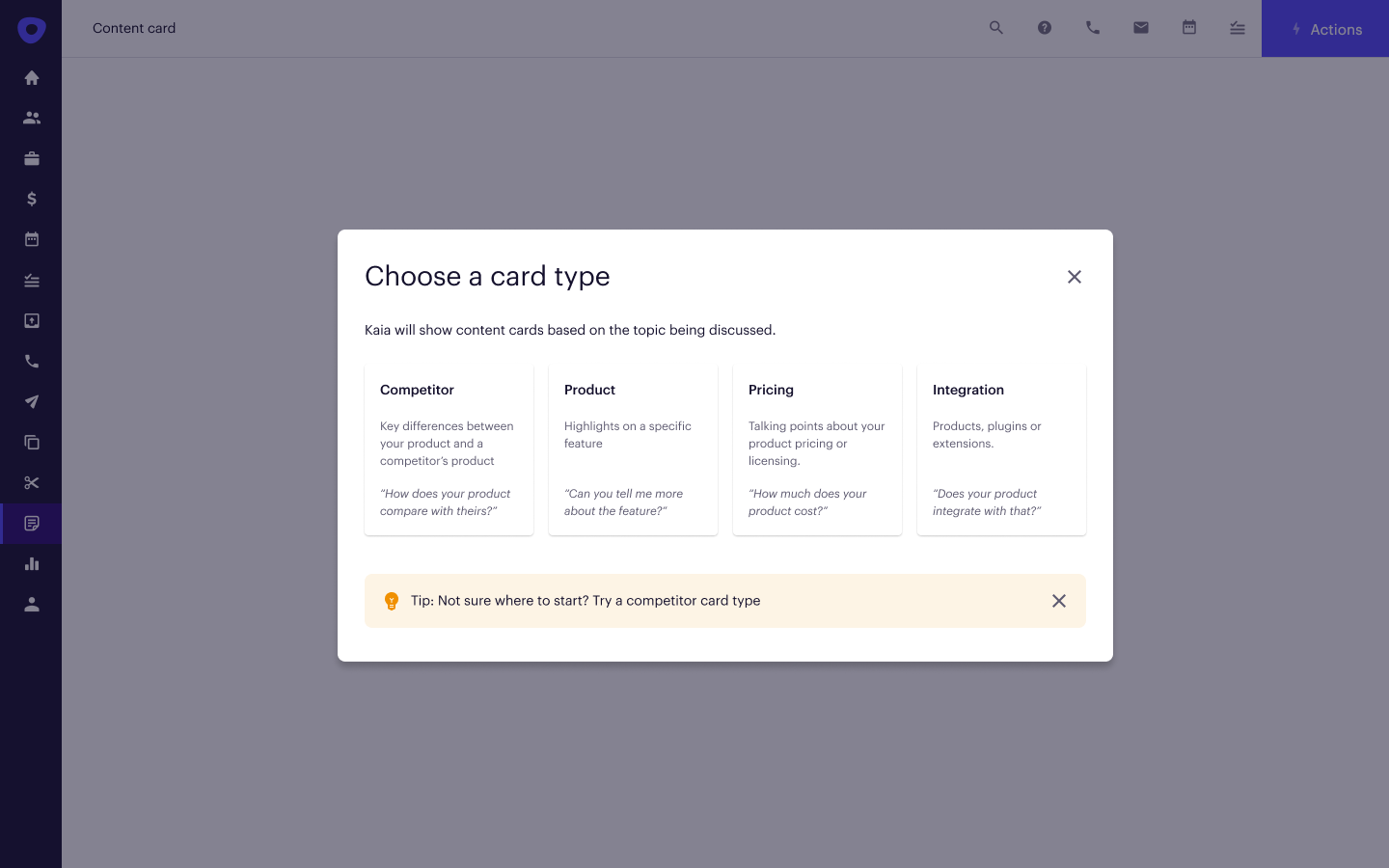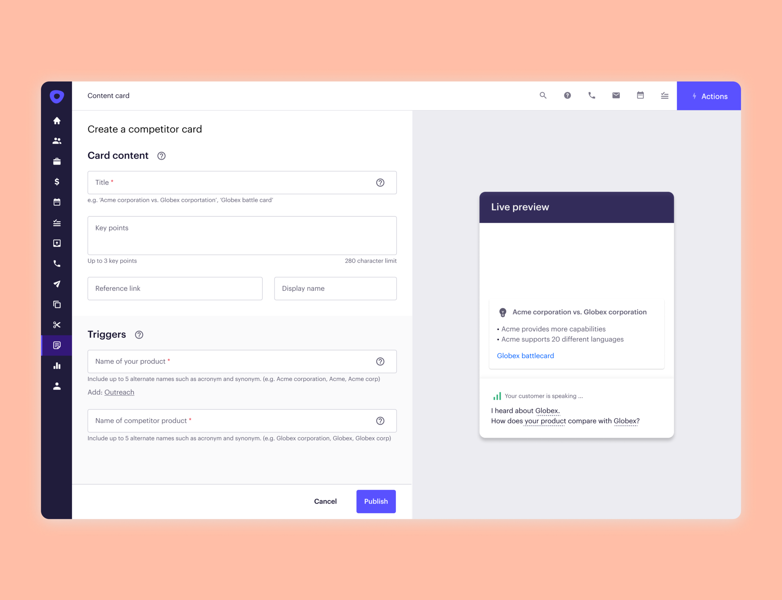 Provide sales representatives with concise and relevant content cards created by sales enablement team during live calls with prospective customers